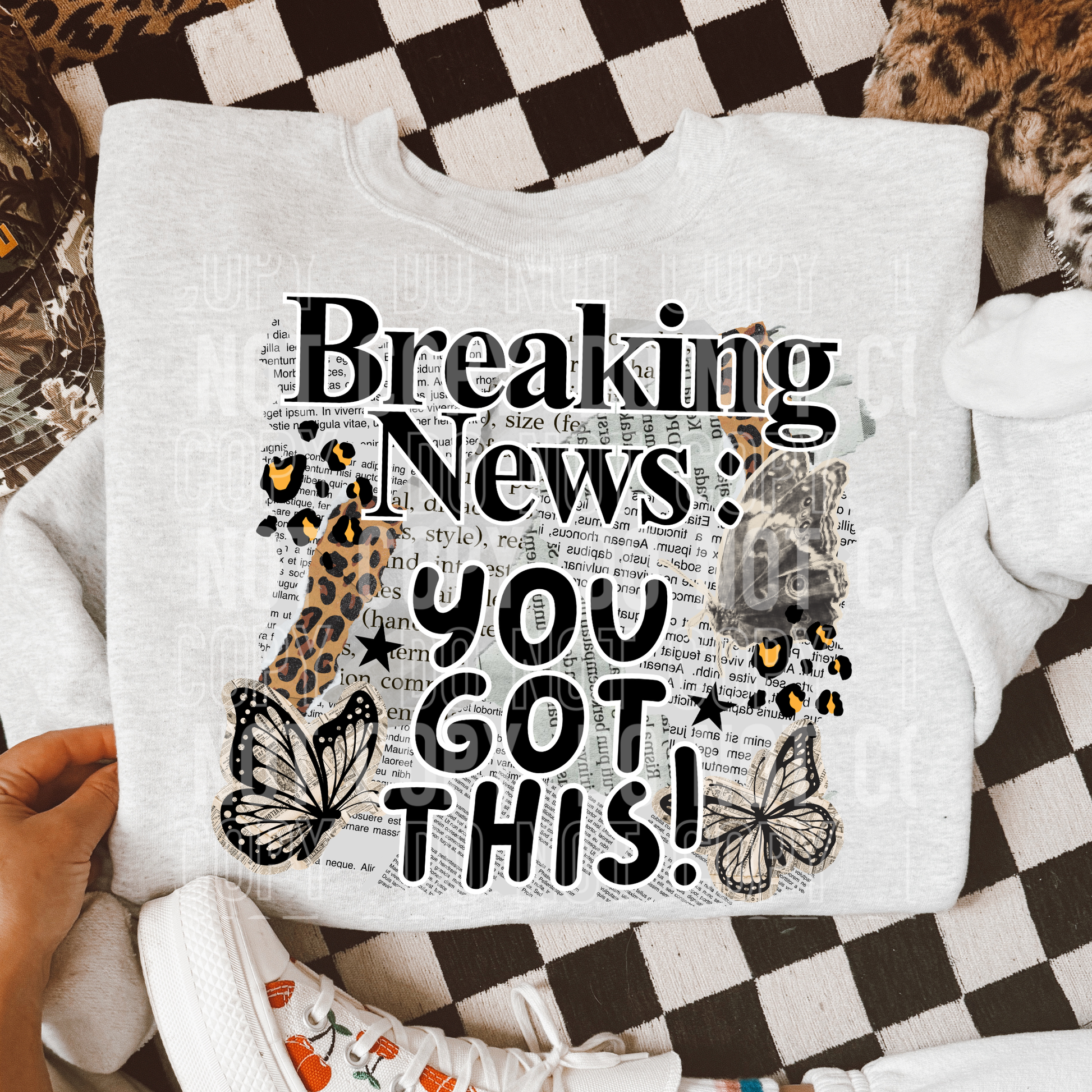 Add a bold motivational statement to your apparel with this “Breaking News: You Got This” DTF transfer. This eye catching design features a vintage newspaper background, leopard print accents, and butterflies for a trendy mix of grunge and girly style.