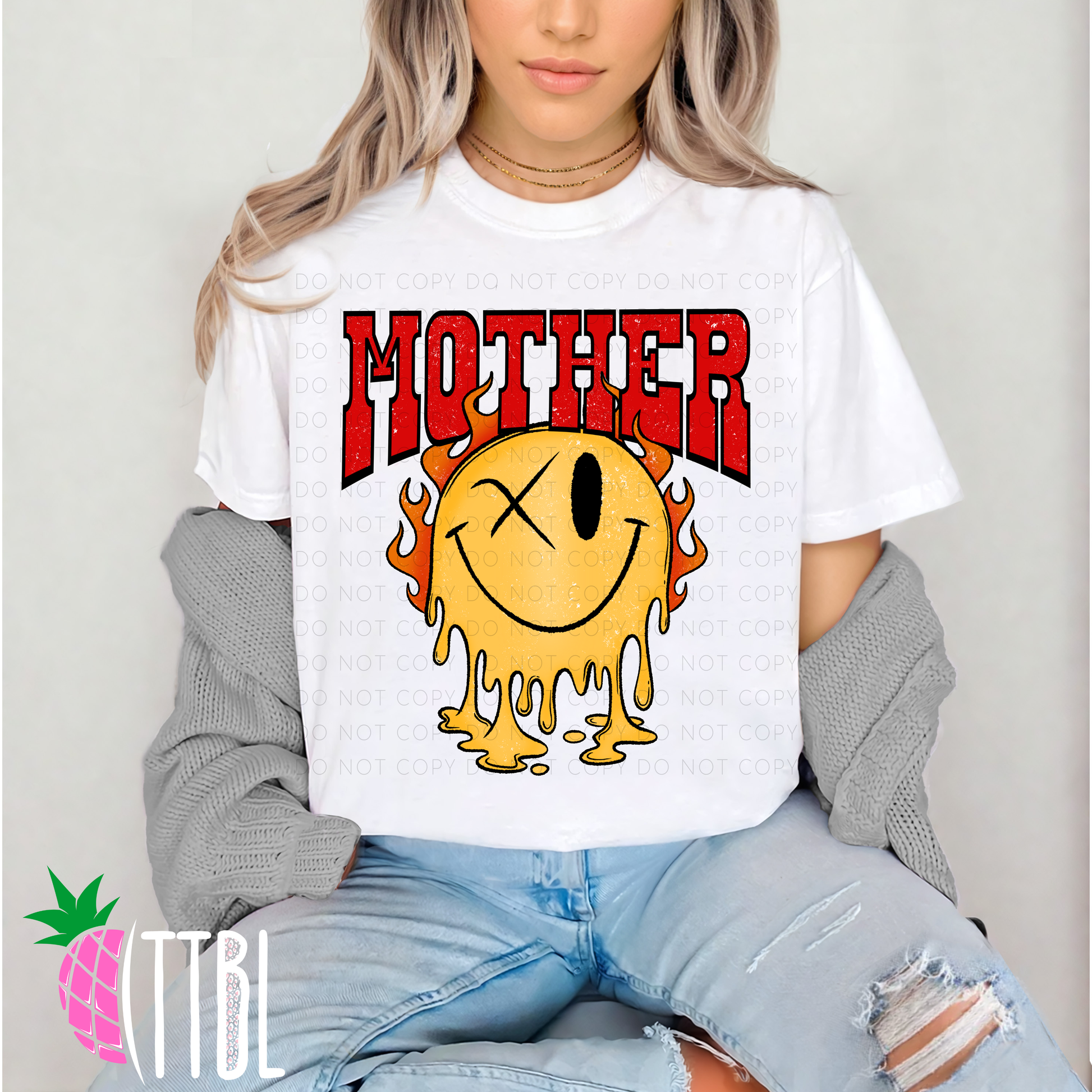 Bold, edgy, and just the right amount of chaotic, this MOTHER DTF transfer is a statement piece that brings attitude and style together. Featuring a distressed smiley graphic with flame details and bold lettering, this design is perfect for trendy graphic tees and standout boutique apparel.